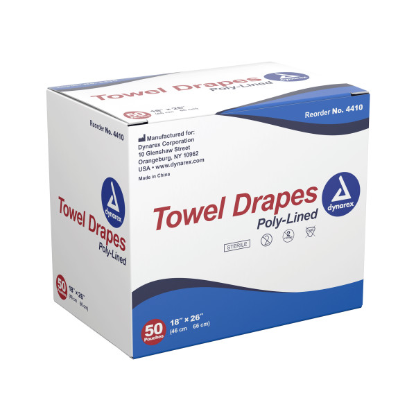 Dynarex Disposable Towel Drapes provide a sterile drape for use in minor surgical or therapeutic procedures. The drapes are 3 ply with a poly-interlined lining that provides absorbency, while preventing possible moisture or bacteria migration. The Towel Drapes are available in both plain and fenestrated options.
