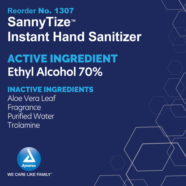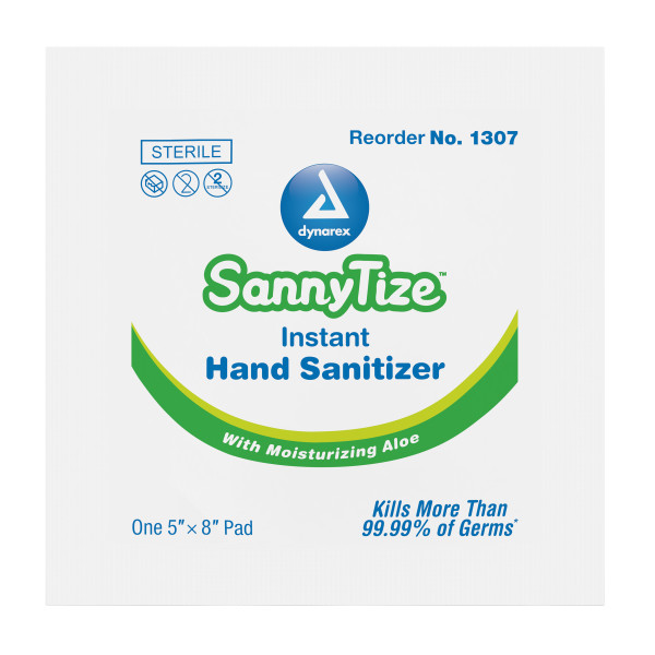 Instant Hand Sanitizer is an alcohol-based disinfectant gel that eliminates more than 99% of germs and bacteria. The liquid formula evaporates completely in just a few seconds. The sanitizer is infused with aloe vera to help soothe and moisturize skin. A variety of Dynarex SannyTize products are currently available; including pump bottles, to-go packets, textured wipes, and more.